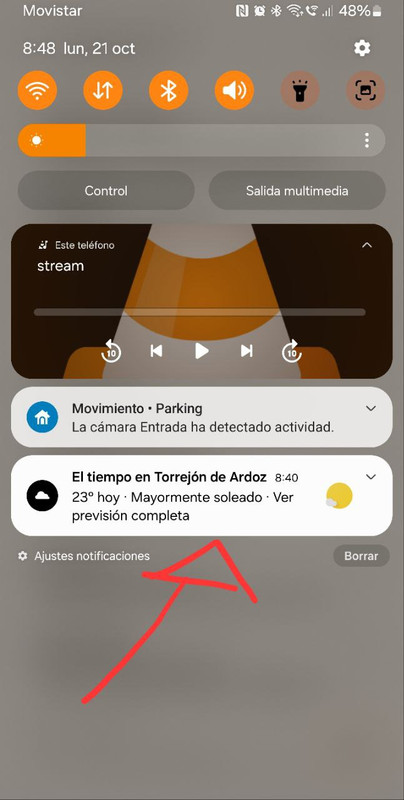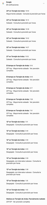 Si, a esas, pero esa es la de la previsión del día, esas si las recibo, las qué no me muestra el móvil son las qué van saliendo durante el día y la de los partidos de fútbol y baloncesto, solo las veo si entro en el icono de la campana al lado de la foto de mi perfil, PD: estoy escribiendo desde el s24 ultra y he visto que había una notificación del clima dentro de la campana y el móvil no la notificado.