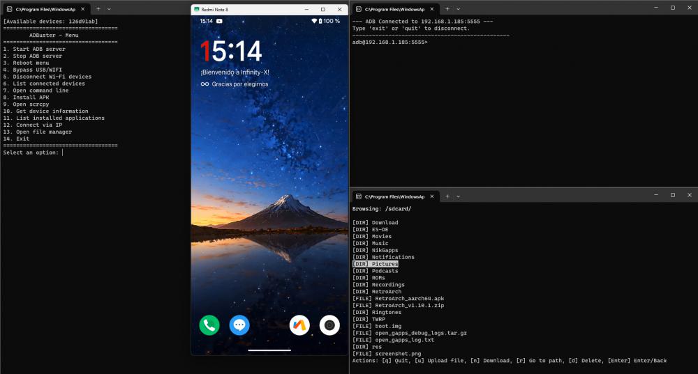 ¿Qué ofrece ADBuster? - Interfaz de Menú Interactiva: Navegación intuitiva desde la terminal, con soporte bilingüe (español/inglés). - Conexión Flexible: Compatible con dispositivos conectados por USB o por IP a través de Wi-Fi. - Funciones Potentes: - Instala APKs seleccionándolos gráficamente desde el explorador de archivos. - Reinicia el dispositivo en modo normal, recovery, fastboot o EDL. - Controla y refleja la pantalla de tu Android con scrcpy integrado. - Explora archivos del dispositivo, lista aplicaciones instaladas y ejecuta comandos ADB personalizados. - Modular y Extensible: Añade scripts externos (como explorador de archivos o terminal (Incluidos)) para más funcionalidades. - Ligero: Funciona con Python 3.8+ y pocas dependencias (pure-python-adb, scrcpy). Planes futuros ¡ADBuster seguirá creciendo! Planeo añadir nuevas funcionalidades, como herramientas avanzadas de automatización y mejoras en la gestión de archivos. ¿Tienes ideas de qué te gustaría ver en el proyecto? ¡Compártelas conmigo! ¡Únete al proyecto! Me encantaría conocer vuestras opiniones: ¿Sugerencias o problemas? Abre un issue en GitHub. ¿Quieres colaborar? Los pull requests son bienvenidos. ¿Lo has probado? Comparte tu experiencia o casos de uso aquí. ¡¡Hagamos que la gestión de dispositivos Android sea más fácil juntos!!. https://github.com/re-3v0lv3d/ADBuster