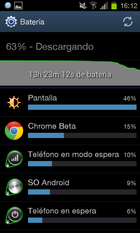![]() El móvil dejó de cargar ayer a las 3 de la mañana, y lo encendí por primera vez esta mañana a las 13h, en ese momento tenía un 100 o 99% de batería... Chequeé mis correos, whatsapp y tuenti y bajó al 95 o así a las 14h. A partir de ahí lo he ido usando ininterrumpidamente con Chrome, Whatsapp y demás aplicaciones como Market y tal y ahora mismo a las 16:24 está al 63%. ¿Es normal que haya bajado hasta el 63% a estas horas? Un saludo. ![]() Pon las horas de pantalla si puedes porque de otra forma no te podemos decir si es buena duracion Enviado desde mi GT-I9100 usando Tapatalk 2 |