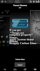 El tema fue originalmente construido para ICS, pero he ido añadiendo más y más de los objetos JB como el tema va. Actualmente estoy aún en marcha ICS para probar los cambios es un poco difícil. ¿Qué temáticas: Marco y los iconos asociados sistema de interfaz de usuario Configuración LatinIME (teclado) Aplicaciones del sistema Market Apps - Gmail, (G+ en la actualización que viene), Plume, YouTube Más aplicaciones seguirán siendo añadido, así como la adición de más en las aplicaciones actualmente temáticas. INSTRUCCIONES ********* *********** ESTO ES PARA Rooted phones only ..... xHDPI y IPAP SOLAMENTE No me pregunte cómo erradicar el teléfono, no voy a decirte. Instalación, Configuración Aplicar en Temas, Reboot. Si recibe un mensaje de error diciendo que el tema no fue compilado correctamente realice lo siguiente: Aplicar tema System reiniciar Aplique Glass Carbon Reboot (para completar la instanciación Theme) Si el fondo de pantalla no cambia (muy común), sólo volver a aplicar el tema y lo hará. No es necesario reiniciar después de ese paso. * Reiniciarlo después de asegurarse de que todo GETS APLICADA ... incluso después de las actualizaciones * * NO CONTINUAR CON SDCARD .... provocará errores * Si no tienes idea de lo que eso significa entonces POR FAVOR NO DESCARGAR! Siéntase libre de preguntas por correo electrónico. ![]()
