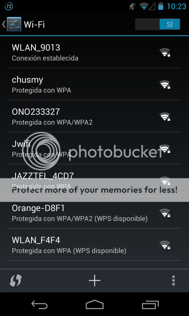 Resulta que mi nexus 4 marca que pilla el wifi con poca intensidad. Vamos, de las 4 "rayas" marca 3 o 2 normalmente (incluso he llegado a ver 1) fluctuando bastante (estando el móvil en el mismo sitio claro). Pero el ordenador y el nokia 5800 que tengo al lado me marcan la intensidad al máximo (pongo fotos). Por lo demás no he notado nada en cuanto a navegación (cierto es que tampoco he estado fijándome en cada momento cómo iba y que tampoco he tirado mucho en ese aspecto), pero me mosquea que pueda captar mal el wifi ya que el router está en la habitación de al lado. ¿Alguno más ha notado esto? coge mal la señal o es que la escala de las rayas es distinta?. Sabeis de alguna aplicación que me dé exactmente la intensidad en db que recibe? (para poder compararlo con el ordenador). Pongo un par de fotos para que veais lo que digo: ![]()
