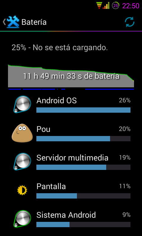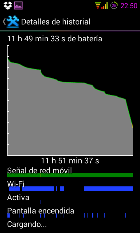 Según lo quito del cargador baja la batería muy deprisa, luego ya se estabiliza y la disminución se va haciendo más lenta... Os pongo unos pantallazos, a ver si véis algo raro Screenshot_2013-08-23-01-41-09.png Screenshot_2013-08-23-01-41-27.png Screenshot_2013-08-23-01-41-58.png Yo lo que no entiendo es por qué hay un porcentaje tan alto de multimedia, cuando no tengo ninguna aplicación abierta... Ahhh, antes cuando apagaba o reiniciaba el teléfono el contador del estado de la batería no se me ponía a 0, sin embargo, ahora sí... hay alguna opción que deba marcar para que no pase? Un saludo |