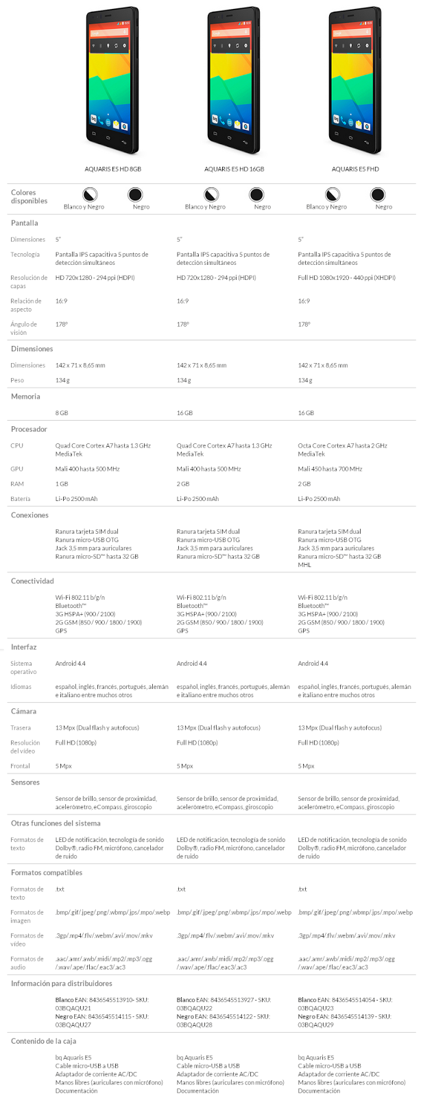 Fuente: https://twitter.com/htcmania -BQ Aquaris E es el primer Smartphone de la marca diseñado íntegramente en España. -BQ Aquaris E constará de cuatro modelos: E4, E4.5, E5 y E6. -Cada uno de ellos vendrá con un SO 4.4.X KK -El aspecto sonoro parece haberse cuidado mucho en la nueva gama. -Tendrán cuerpo unibody. -NO contarán con 4G, y seguiremos con MTK. -Peso de 135gr aproximadamente. -Grosor de 0.8 cm -Los precios estarán comprendidos entre los 129(E4) y 299(E6) -En la imagen de las prestaciones el E6 tiene 1GB de ram, pero BQ acaba de confirmar en su cuenta de Twitter que es un error y el terminal dispone de 2GB. (Gracias a khram por el aviso) Añadida nueva iamgen gracias a asturel Capturas con especificaciones de cada uno y fotografías de todos los modelos: Última edición por MrErnyy Día 21/05/14 a las 14:10:47. |
