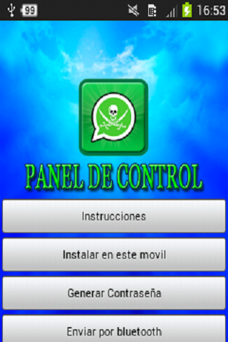 El funcionamiento es complejo a primera vista, pero en realidad es muy sencillo. Cuando descargamos esta aplicación lo primero que vamos a ver es un menú (Panel de Control) con varias opciones. Accediendo a la primera leemos las instrucciones, muy importantes si queremos saber como funciona y como hacer un uso perfecto de ella y no levantar ninguna duda a nuestra "víctima". Con la segunda la instalamos para comprobar su funcionamiento (No hay peligro, de hecho es bueno para entenderla). Con la tercera Generamos una contraseña con nuestro Nombre y Apellidos, que quedarán codificados a Base64. Y con la cuarta y la quinta enviamos la aplicación de formas diferentes, por link y Bluetooth.