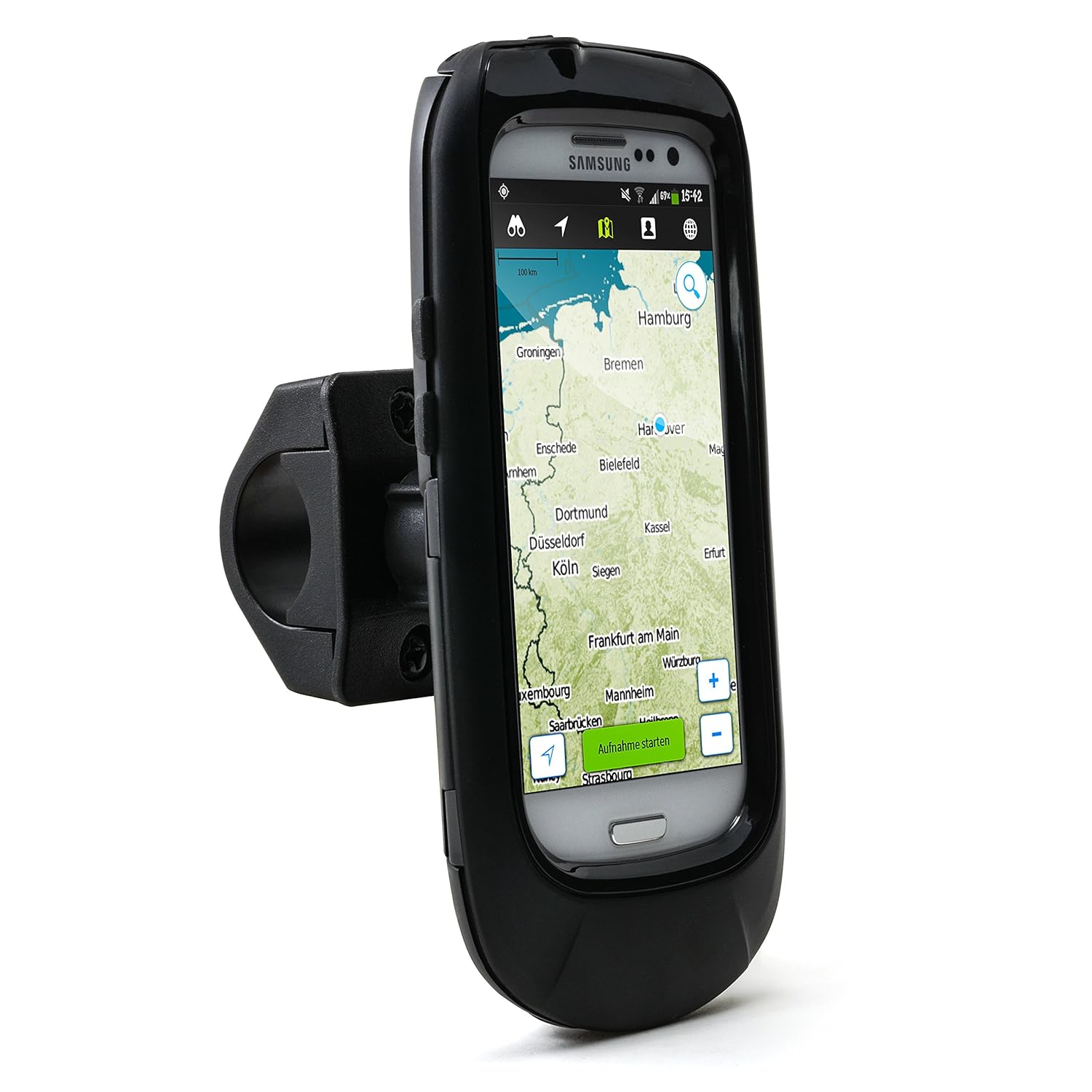 Llevo un tiempo usando el Runtastic Mountain Bike y compré para esto un soporte que vi en alguna página china con buen aspecto. Pero la verdad es que en el primer bache, el teléfono salió volando. Tengo que llevarlo asegurado con gomas. Es universal pero ahora pienso que no es una ventaja. Como el del propio teléfono no hay nada.