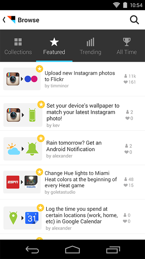 Como podéis ver, esta aplicación es realmente útil, ya que puede programar diversas acciones con muchas aplicaciones, casi todas de un terminal. Aparte, claro está de crear tus propias recetas y compartirlas. Me gustaría que de este hilo surgiesen personas que ya tengan la APP y nos mostraran sus recetas más útiles o personas interesadas en ellas, muchas gracias, a continuación os dejo con las imágenes de algunas recetas.