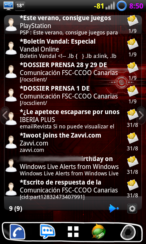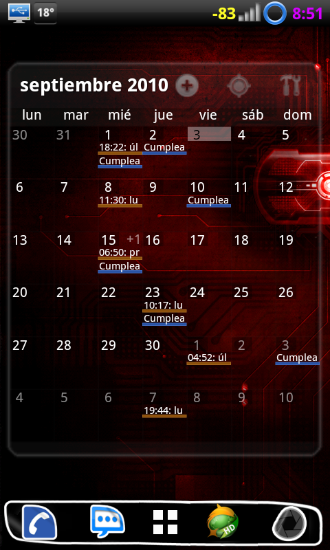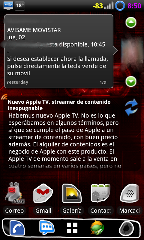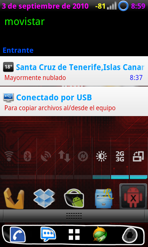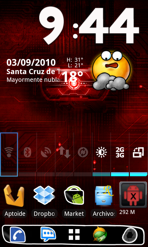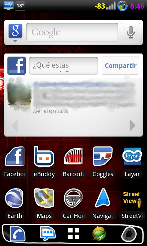 ![]() ![]() ![]() ![]() ![]() ![]() ![]() ![]() ADW Theme Sticker, 5 Filas x 5 Columnas Live Wallpaper Droid 2 Eye X Red 1ª Imagen: Beautiful Widgets, Control de Energia de Superfroyo, 5x3 2ª Imagen: SMS Medio de Hancent SMS 5x2, AnyRSS Reader 5x2 3ª Imagen: Pure Messenger + K9 for Pure 5x5 4ª Imagen: Pure Grid Calendar 5x5 5ª Imagen: Wifi Manager4x1, Bookmarks (Dolphin) 4x4 6ª Imagen: Musica 5x1, Beyondpod 5x1, Youtube 5x1, Tapatalk Pro 2x1 7ª Imagen: Busqueda de Google 5x1, Facebook 5x2 8ª Imagen: Barra Despeglabe Salu2 Última edición por VENABLES Día 03/09/10 a las 10:57:39 |