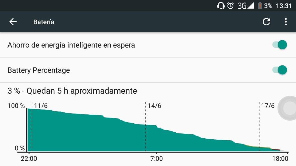 Aclaro este punto para que se entienda por que algunos vídeos pueden presentar problemas de saltos de frames o relentizaciones. También aclaro que, dado que el dispositivo cuenta con un panel FullHD con una resolución de 1920x1080, esta resolución no es la idónea para jugar ya que la GPU va bastante "justa" en cuanto a rendimiento, por este motivo en algunos videos he bajado la resolución a la mitad (960x540, 240dpi) para obtener gameplays mas suaves. Para entender la diferencia, prestar atención al gameplay de Brother in Arms 3, donde he capturado con distintas resoluciones y métodos en los cuales queda patente estas diferencias. Brothers in Arms 3 Resolución 1920x1080 Resolución 860x540 He capturado 2 gameplays de este juego, uno con la resolución original del dispositivo, esto es, FullHD (1920x1080), y otro con la resolución reducida exactamente a la mitad, para poder apreciar la diferencia de rendimiento entre ambos modos. Como se puede ver, en 860x540 va muchísimo mas fluído y, por tanto, si queremos jugar en este dispositivo deberíamos plantearnos cambiar la resolución para sacar un rendimiento mucho mejor en juegos en general. Esta es una captura de vídeo del juego, utilizando una capturadora EzCast, la cual utiliza algo de la CPU del dispositivo para realizar el trabajo de captura externa, pero en general se ve bastante fluído y con muy buena calidad de imagen. Asphalt 8 Crazy Taxi N.o.v.a.3 fAw" frameborder="0" allowFullScreen> Soulcraft Need for Speed Most Wanted AVP Evolution Beach Buggy Racing Six Guns Sonic All Star Transformed UFC The Dark Knight Rises Mortal Kombat X Horizon Chase Deus Ex The Fall Emulación de otros sistemasPrincipalmente para jugarAsí como los juegos propios del sistema (Android) son una base importante para destacar el desempeño de un dispositivo, la emulación es otro factor muy a tener en cuenta, sobre todo cuando se trata de sistemas mas complicados de emular, y que es ahí donde se puede apreciar que tal puede rendir un dispositivo. En la emulación tenemos un espectro amplio de posibilidades/sistemas, que podemos recrear en el dispositivo. Podemos ir desde ordenadores, videoconsolas antiguas, incluso hasta sistemas x86 (MS DOS, o Windows 9x, aunque muy limitado), llegando hasta la emulación de sistemas mas modernos como puede ser Nintendo 64, Playstation one (PSX), ambos como tope "standard" del estado actual de la emulación, pero que no se queda ahí puesto que también es posible ejecutar algún emulador de Dreamcast (aunque no existe una aplicación oficial) que en los sistemas actuales puede ejecutarse con bastante soltura, eso sí, sin audio, y el estado actual de emulación está llegando a ver unos progresos muy importantes en PSP, con muchos títulos jugables casi al 100% de velocidad, y con el nuevo emulador de Nintendo DS. Así y con todo esto, podemos decir que los emuladores son igual de importantes en cuanto a entretenimiento se trata que los juegos propiamente tal del sistema Android, y por tanto en mis articulos forman parte de mi batería de pruebas. A continuación hay algunos ejemplos de juegos corriendo en emuladores, para hacernos una idea general de la capacidad que tiene el dispositivo, en cuanto a retrogaming se refiere. PPSSPP - Tekken Dark Resurrection Mame4Droid - X-Men vs Street Fighter PPSSPP - Metal Gear Solid Peace Walker Acerca del uso de la bateríaEsta sección de la review generalmente la escribo varios días después de haber publicado la primera parte de la misma, y es que para poder hablar de la batería es necesario un uso del dispositivo por algunos días, para poder tener una experiencia mas realista y que no esté basada en los datos proporcionados por el fabricante. Las siguientes son capturas de pantalla de la batería del móvil utilizado por mi mujer Como se puede ver, son cargas consecutivas y que mas o menos tienen un ciclo de una semana. El uso que da al móvil es mas realista que el mío, que yo con todas las pruebas que estoy haciendo, me es muy complicado establecer una media de duración de las baterías, por que así como a ella le puede durar una semana (que es lo que le dura actualmente, cargando siempre los sábados), yo puedo fundirme la batería en un día por las pruebas con juegos, descargas constantes por wifi, etc. Como he comentado en alguna ocasión, mi consumo diario de batería está en torno a los 2000 mAh en el móvil, que es un consumo creo que normal (puede que incluso un poco mas, dependiendo de lo que haga con el movil, por que días que pueda jugar mas, títulos tipo Modern Combat 5 o similar, el consumo se dispara), asi que con este cálculo de consumo diario estimo que unos 3 días de uso me deberia dar la batería. (insisto, es en mi caso) Además de esto, la opción de carga inversa resulta especialmente interesante, ya que podemos transformar nuestro dispositivo en una batería externa para cargar otros dispositivos. El terminal incluye además un software específico llamado PowerSaver, que nos ayudará a prolongar la carga de la batería Podemos configurar esta App para que se active cuando tengamos un umbral de carga de batería Podemos establecer el comportamiento del terminal cuando se active el modo "Smart-saving mode" Los modos disponibles son: