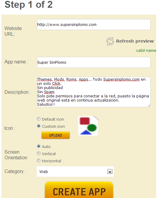 Navegando por la red he encontrado una genial herramienta que nos permite crear nuestras propias aplicaciones. Lo mejor de todo es que requiere un nivel mínimo de conocimientos. ¿Como cuánto de mínimo? -Con que sepas encender el ordenador es suficiente. No estoy hablando de crear un nuevo Whatsapp, ni el mejor juego gráfico, ni siquiera un 3 en raya baratito... estoy hablando de algo fácil, rápido y sencillo. Mi aplicación es esta: Super Sin Plomo Themes, Mods, Roms, Apps... Todo Supersinplomo.com en un solo clic. Sin publicidad. Sin Spam. Solo pide permisos para conectar a la red, puesto la página web original está en continua actualización. ¡¡Saludos!! Si no puedes instalar tienes que habilitar fuentes desconocidas. Ajustes/seguridad/orígenes desconocidos Ahora el "cómo se hace": Lo primero de todo es visitar esta web: http://www.appsgeyser.com/create/url Hay que rellenar los campos en blanco, os pongo una imagen con los que utilicé yo. Una vez pulsado el botón de CREATE APP os pedirá crear una cuenta (rellenar 6 campos, ni siquiera pide e-mail de confirmación). A continuación se generara un link para compartir vuestra aplicación. El mio es: http://www.appsgeyser.com/getwidget/Super%20SinPlomo . Allí veréis un botón de descarga y un código QR para descargar también usando goggles o QR reader... Después tendremos la opción de añadir publicidad a cambio de recibir dinero y también la opción de añadirla al Google Play Store (Market). Repito: No olvides habilitar fuentes desconocidas. Ajustes/seguridad/orígenes desconocidos sino no podrás instalar la app salvo que la descargues desde Play Store. Un consejo: Si decides subir tu propio icono, te recomiendo que uses formato PNG y que el fondo sea transparente. De este modo, sea cual sea el fondo de pantalla, siempre se verá el icono bonito. Con Photoshop es un plis y con GIMP también es fácil. |