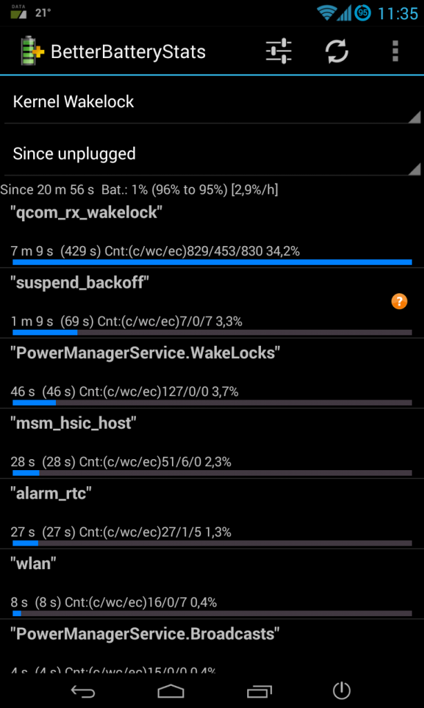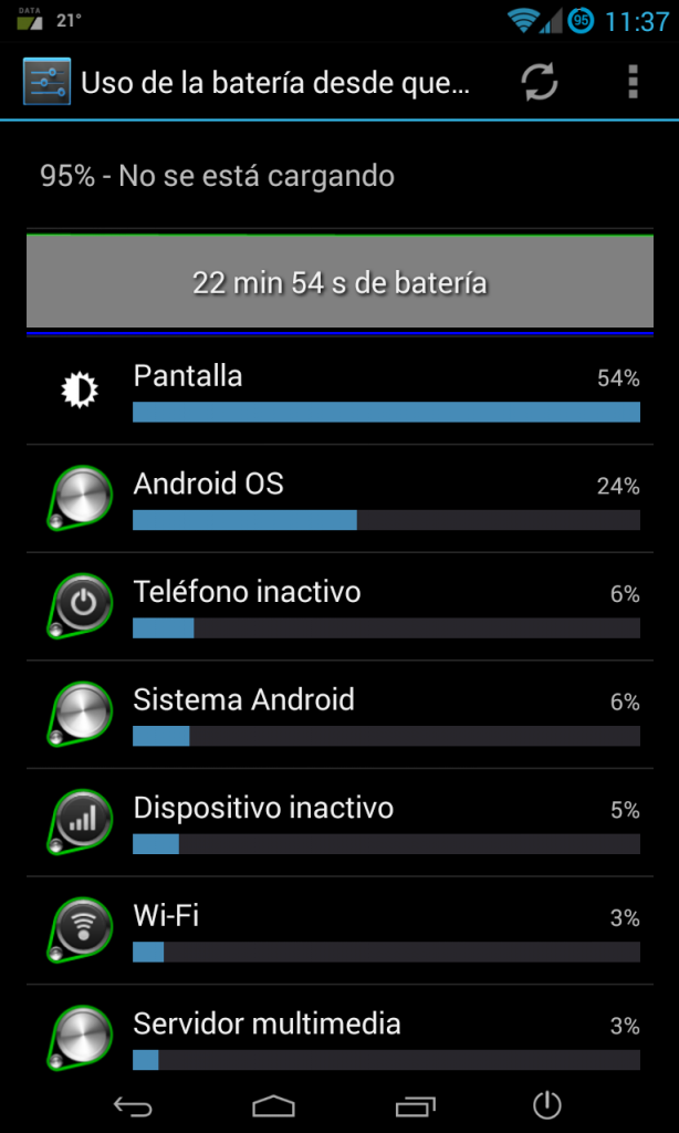 Os dejo unas capturas de mi primer ciclo de la última rom de elite y último Ángela kernel. Todo con WiFi menos 2 horas que me fui de casa y estuve escuchando música con bluetooth, todo activado, brillo automático, Google Now, widgets, etc...