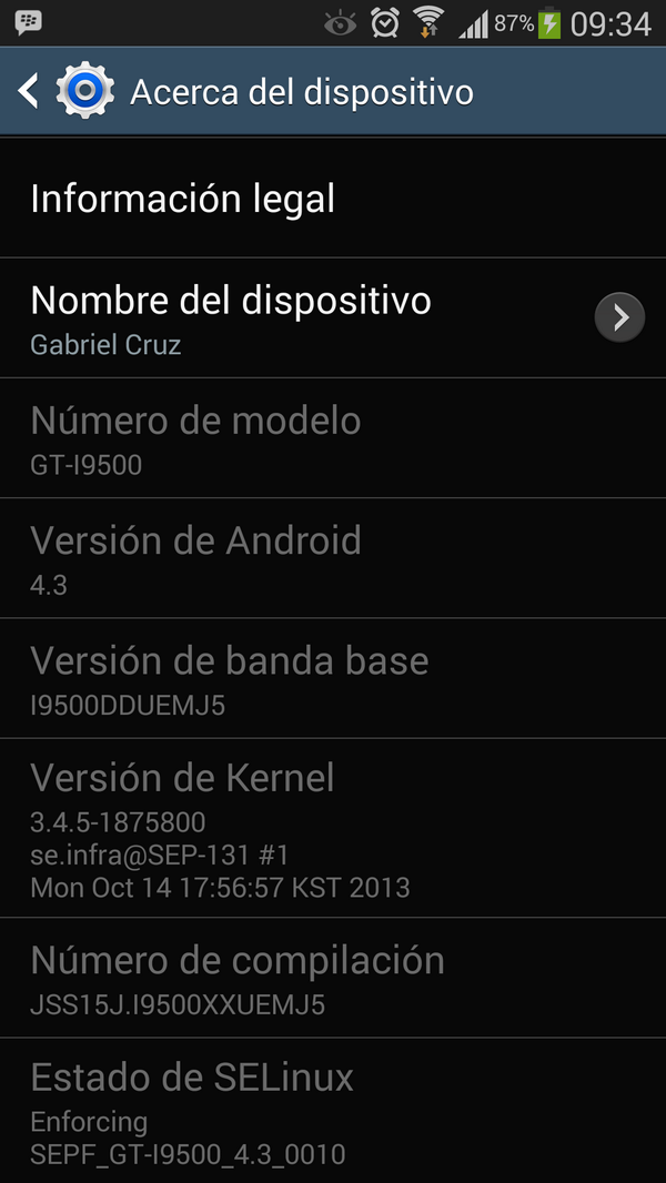 Le di actualizar, descargo el archivo e inicio la descarga y posteriormente la instalación en el equipo. Al finalizar quedé con la 4.3 (i9500DDUEMJ5) ![]() Posteriormente procedí a rotearlo, lo cual se ejecutó con éxito y ahora dispongo de un equipo roteado con 4.3 trabajando sin problemas. Esto con un equipo de Telcel (México) liberado de fábrica. |