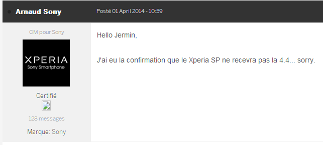 Sinceramente no me creo eso de que no venga la 4.4 a nuestro movil, he visto el foro original de la cual sale la noticia y la fecha del post del usuario que lo confirmaba era el 1 de abril... april's fool descarado y sony no lo ha dicho oficialmente y en la web del xperia sp sigue poniendo bajo investigacion.