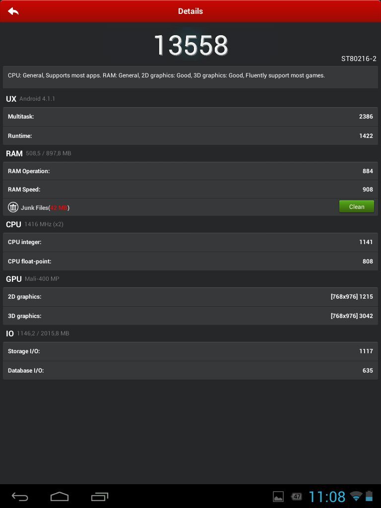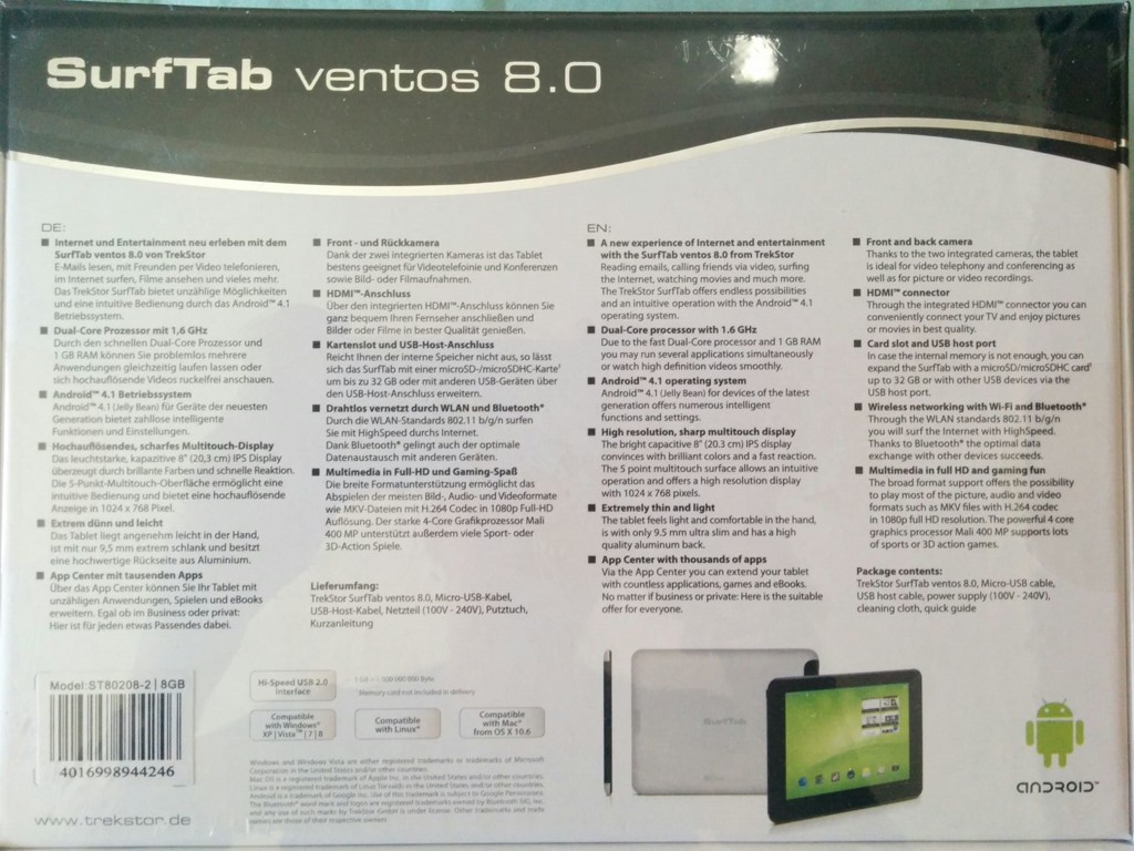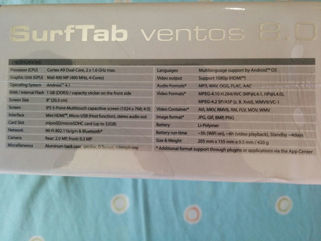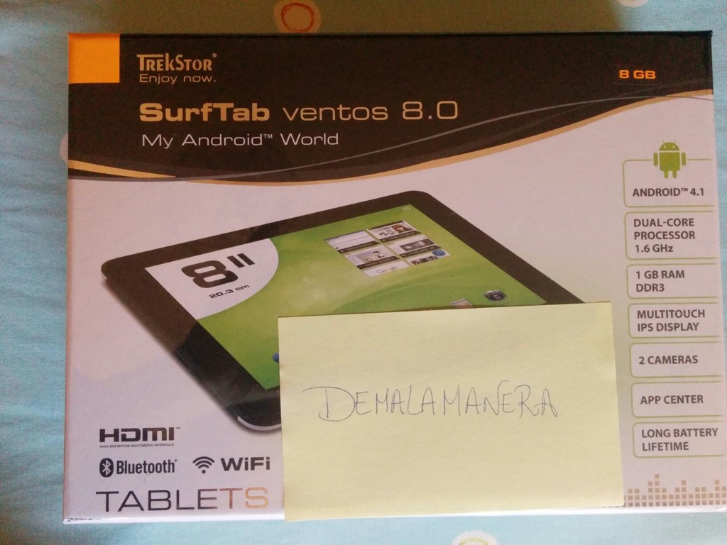 * Sobre el envío: Envio por correos certificado incluido en el precio, si se prefiere otro metodo de envio se puede hablar. * ¿Dispones de factura?: No * Fecha de la factura: - * ¿El producto está en garantía?: No lo sé Otros datos de interés * Descripción general y otros comentarios: Dispongo de tres unidades de Surftab Ventos 8.0 de 8gb, todas precintadas. Pertenecen a mi suegro que las consiguió para regalos de empresa que finalmente no se llegaron a entregar. A poco que busqueis vereis que se venden en media markt por 90€. Es una tablet básica, ideal para alguien que se inicia en el mundillo android o para que un niño juegue al pou y vea alguna película en el coche sin que peligre vuestro smartphone :P Para que os hagais una idea del rendimiento adjunto una captura de Antutu, hecha en la tablet de mi suegro ya que él se quedó una. Las caracteristicas de la tablet son: Procesador (CPU) Cortex A9 dual core, 1.6 GHz RAM 1 GB (DDR3) Capacidad de la memoria 8/16 GB* Unidad de Gráficos (GPU) Mali-400 MP (400MHz, 4 cores) Tipo de pantalla Pantalla capacitiva de 5 puntos Multitouch Tamaño de la pantalla 20.3 cm (8") Screen resolution 1024 x 768 Pixel (4:3) Cámara Trasera: 2.0 MP, Frontal: 0.3 MP Interfaz Mini HDMI (hembra), Audio estéreo hacia fuera, Micrófono, Bluetooth® , WiFi , 1 x Micro-USB 2.0 (hembra), Cámara, Lector de tarjetas Lector de tarjetas (formatos de tarjetas compatibles) microSD , microSDHC (max. 32 GB) G-Sensor Rotación automática en 4 direcciones Dimensiones (L x A x A) 205 mm x 155 mm x 9.5 mm Peso Approx. 420 g (sólo el dispositivo sin accesorios) Carcasa Aluminio, Plástico WiFi IEEE 802.11b/g/n Sistema operativo Android™ 4.1 (Jelly Bean) Fuente de alimentación Batería de polímero de litio (4300 mAh) Tiempo máximo de funcionamiento Approx. 5 h (WiFi activado), Approx. 5.5 h (WiFi apagado), Standby (approx. 4 días) Tiempo de carga Approx. 3.5 horas Idiomas Soporte multilenguaje por Android™ OS 4.1 Contenido del paquete SurfTab® ventos 8.0, Hi-Speed USB 2.0 Host-Adaptercable (Micro-USB / USB-A (hembra)), Panuelo de limpieza, Fuente de alimentación (100 V - 240 V), Guía rápida, Cable Hi-Speed USB 2.0 (USB-A / Micro-USB) * Certifico que la descripción aportada es correcta: Sí * Certifico que no estoy vendiendo un producto ilegal o una réplica: Sí * Acepto las normas de la sección de compra y venta de HTCMania: Sí Fotografías reales del material * |