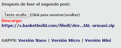 en el texto oculto del primer post xd Después de leer el segundo post: texto oculto (Click para mostrar/ocultar) GAPPS: Versión Nano | Versión Micro | Versión Mini