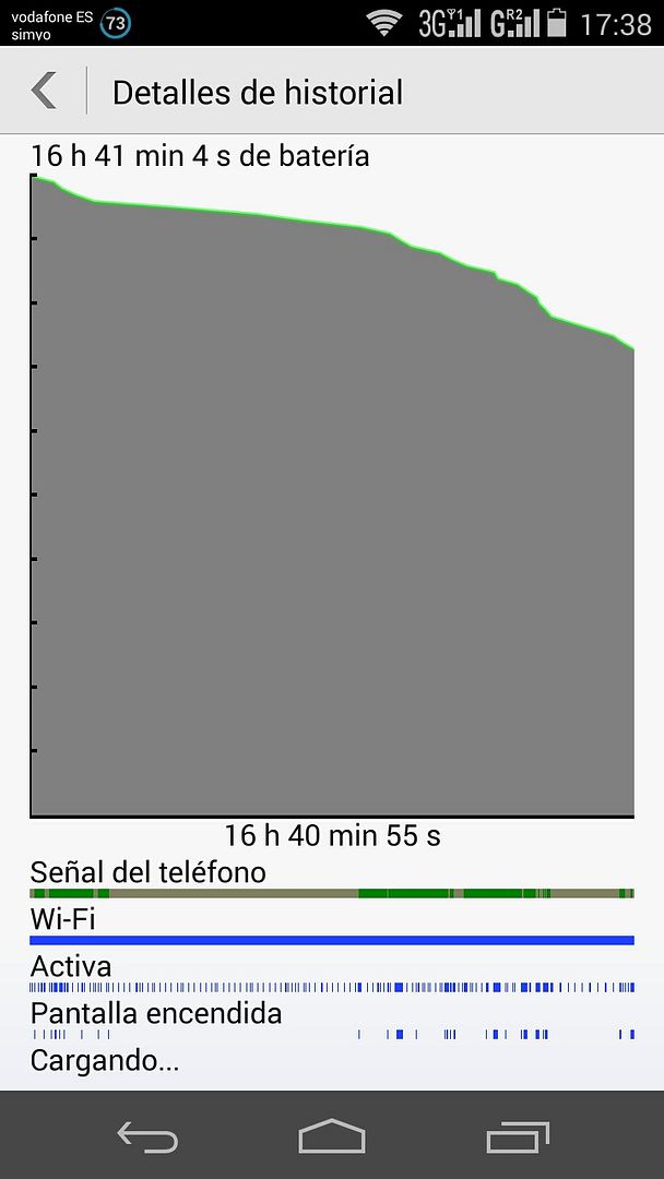 De todas formas, me da que lo que el monitor dice que son app de "Alto consumo" no lo son en realidad, sólo que destacan por encima de la media y las marca de "alto consumo", cuando deberían ser "más consumo que la media". Creo que 16 h de funcionamiento con el 73% de carga de batería todavía, está más que bien. Mi consejo es que no te rayes, el consumo lo veo más que aceptable... Como decía antes, a ver si hago un par de días normales sin tanto trastear y subo unos pantallazos. Salu2, Última edición por Trepanator56 Día 19/11/14 a las 18:35:45. |