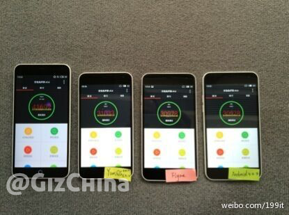 In the image we are seeing a Meizu m1 note (left) alongside 3 x Meizu m1 (mini?). The smaller phones are each running Antutu and appear to be scoring over 30,000 each, however it is difficult to tell what the actual score are.