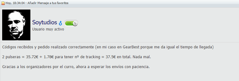 2 pulseras = 35.72€ + 1.78€ para tener nº de tracking = 37.5€ en total. Nada mal.