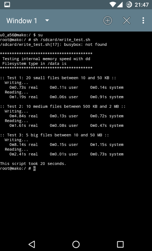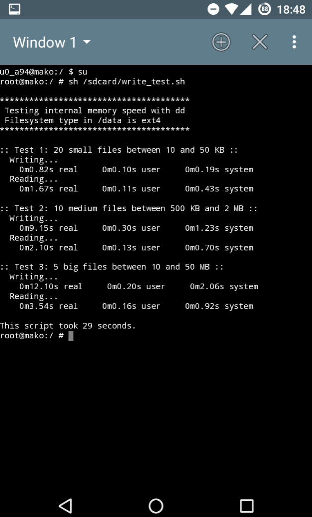 root@mako:/ # sh /sdcard/scripts/write_test.sh