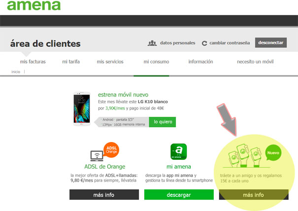 Condiciones: 1. Permanecer dos meses al menos en AMENA tras la solicitud de la promoción ya que el descuento se abonará en la 2ª o 3ª factura desde que se solicite. 2. No son válidas altas nuevas ni portabilidades desde prepago ORANGE pero sí se pueden acoger las portabilidades desde cualquier compañia (Prepago y/o contrato) o desde contrato ORANGE. Una vez realizada la portabilidad a AMENA, debes entrar en tu Area de Clientes, y hacer clic donde te indico en esta imagen: ![]() e insertar el número de teléfono 616 732 656 Si lo necesitas te informo o ayudo por privado. Un saludo y gracias. Chechume Última edición por Chechume Día 31/03/16 a las 08:43:55. |