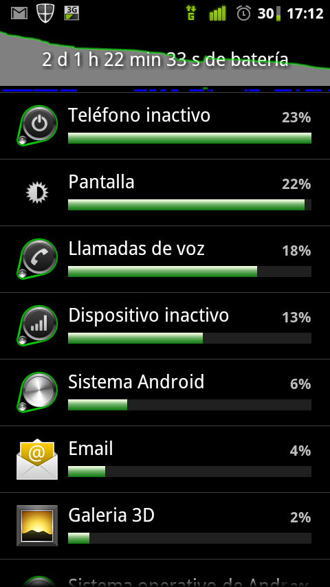 Con 2G, GSM, JuiceDefender, y con tocar el voltaje en System, Overclock: 18-300 30-600 52-1000 se llega bien con datos a los 2 días con uso medio y sobre todo con la : cm7-110601-1421-NIGHTLY-Jordan.zip Salu2 |