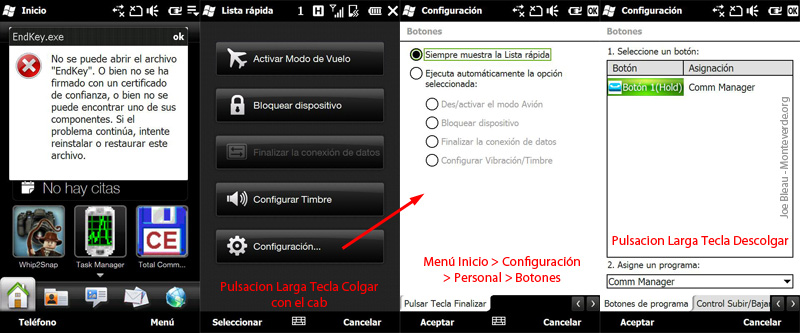 En el ROM GSM 2011.07.K1, aparece un error (No se puede abrir el archivo "EndKey"...) con una pulsación larga de la tecla finalizar (Colgar o EndKey) en lugar de activar la Lista Rápida (Endkey LongPress Quick List). También falta la pantalla Pulsar Tecla Finalizar que se puede encontrar normalmente aquí: > Menú Inicio > Configuración > Personal > Botones > Pulsar Tecla Finalizar.