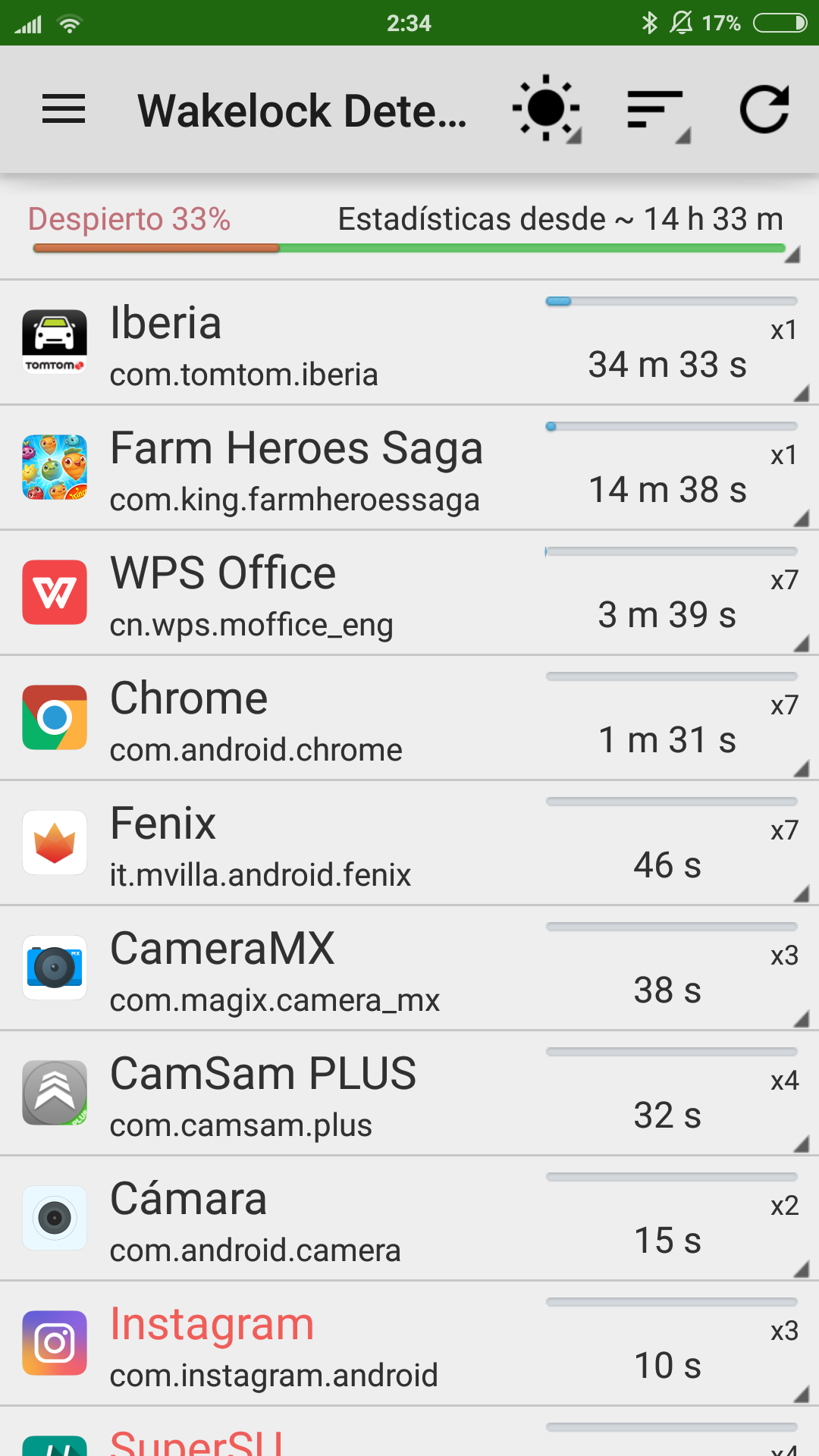 Esta es la versión de android que tengo instalada. ![]() Lo primero que hice que cargar completamente la batería y usar el GServiceFix. Reinicié el teléfono y desconecté el gps y la sincronización. La prueba la hice desde las 12 del mediodía hasta las 2:30 de la madrugada (momento en que quedaba 17% de batería). Durante este tiempo tuve conectado en todo momento Wifi, Datos, Bluetooth. Jugué a un juego unos 15 minutos y estuve utilizando el tomtom unos 30 minutos (con el gps activado, al cerrar la app apagué el gps). Pongo capturas de los resultados de batería y Wakelock Detector: ![]() ![]() ![]() ![]() ![]() ![]() ![]() ¿Que os parecen? |