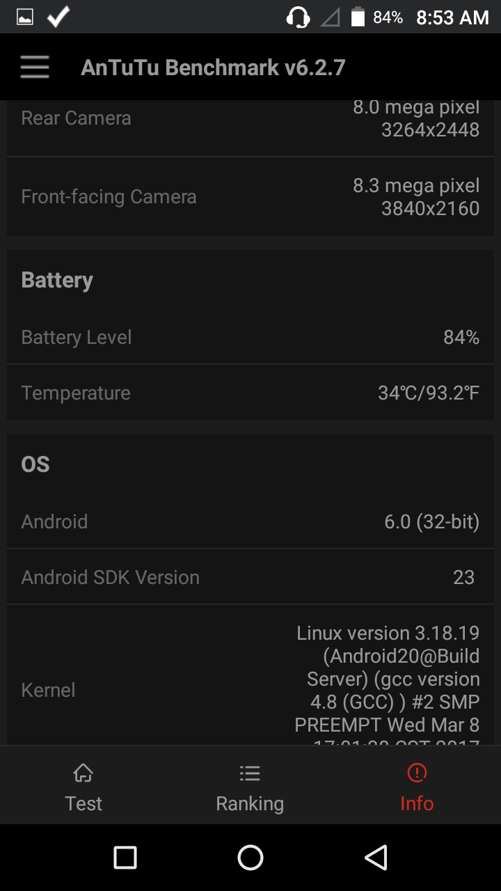 Información desde el propio dispositivoInformación obtenida mediante herramientas de software directamente desde el dispositivo..Para tener una fuente fiable de información del sistema, he obtenido información desde el mismo dispositivo, ya sea desde la misma información que me proporciona el sistema Android (que generalmente es mas bien escueta), como utilizando otros programas que logran sacar mucho mas información, y de forma mas detallada, con lo que nos podemos hacer una idea general del dispositivo en su conjunto. Antutu Benchmark System Info CPU-ZPara quien no conozca estos programas, decir que un benchmark es una herramienta que ejecuta una prueba normalizada que se realiza en un dispositivo. Estas pruebas puntúan (generalmente ponderando varios resultados obtenidos) el desempeño de un dispositivo, de manera tal que el puntaje final puede servir para poder comparar de manera simple y directa el rendimiento general entre varios dispositivos. Existen muchos benchmarks, pero en mis pruebas generalmente utilizo los mas populares. Si tienes alguna sugerencia de un nuevo benchmark, déjame un comentario nombrando el programa específico y la razón, para poder contemplarlo en siguientes reviews. En la práctica, si quieres comparar este dispositivo (del cual estoy comentando en este articulo) con otro que veas por la web, o uno que tu mismo tengas, basta con que encuentres el resultado de alguno de los benchmarks y compararlo directamente con las capturas de pantalla que pongo aquí. Con esto, ya te puedes hacer una idea general de que tal van estas máquinas, comparando sus resultados. Nota acerca de los resultados de los benchmarks Hay que tener en cuenta que estos resultados son meramente referenciales. Es muy probable que si ejecutas estos benchmarks mas de una vez, tendrás mas de un resultado y muchas veces pueden variar de forma sensible. Esto puede suceder por muchos factores (temperatura del dispositivo, carga de memoria mientras se realiza la prueba, conexión a internet, cambios en los sensores como puede ser mientras se mueve el dispositivo, etc, etc). Por esta razón, en muchas ocasiones realizo 3 pruebas de cada benchmark y presento las que mejore puntuación obtiene (por que asumo que es la que mejores condiciones ha tenido para ejecutar dicha prueba) Condiciones de ejecución de los benchmarks Para la ejecución de estos benchmark, las condiciones del dispositivo son: