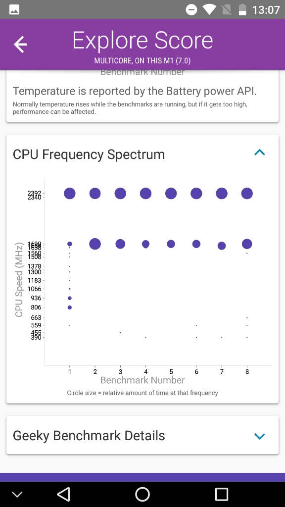 Hay que tener en cuenta que estos resultados son meramente referenciales. Es muy probable que si ejecutas estos benchmarks mas de una vez, tendrás mas de un resultado y muchas veces pueden variar de forma sensible. Esto puede suceder por muchos factores (temperatura del dispositivo, carga de memoria mientras se realiza la prueba, conexión a internet, cambios en los sensores como puede ser mientras se mueve el dispositivo, etc, etc). Por esta razón, en muchas ocasiones realizo 3 pruebas de cada benchmark y presento las que mejore puntuación obtiene (por que asumo que es la que mejores condiciones ha tenido para ejecutar dicha prueba)