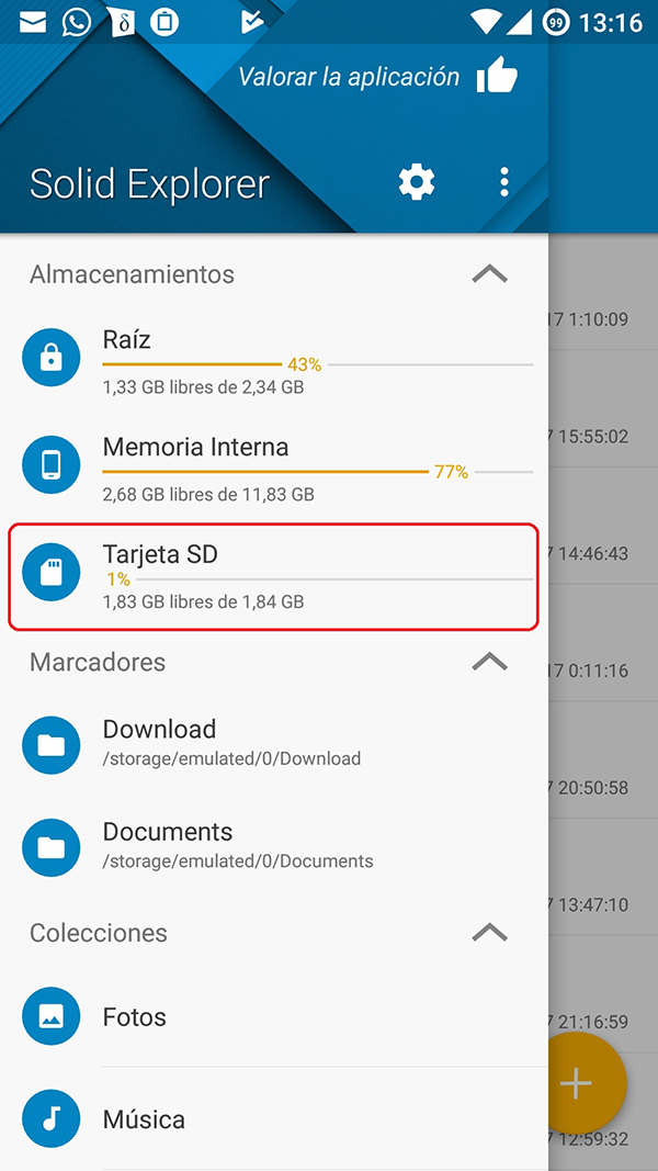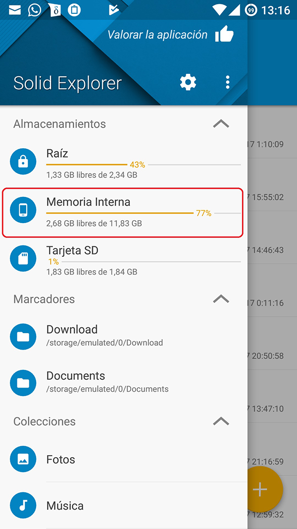Estando en la ventana de la izquierda del todo pulsas arriba en las tres líneas de la izquierda y seleccionas la Memoria Interna. Despues desplazas hacia la izquierda una vez y repites el paso pero poniendo la SD o lo que quieras. Dejo un vídeo y un par de imágenes: ![]() ![]() ![]()