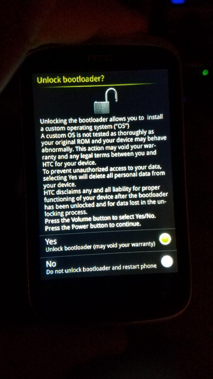 He seguido el procedimiento para desbloquear el bootloader en un HTC Desire C modelo PL01130 y me muestra la pantalla de manera correcta donde se debe elegir "YES" unlock bootloader (may void your warranty) pero no hace nada cuando le doy al botón de encendido, si el botón de encendido lo presiono varias veces seguidas el dispositivo vibra 7 veces y no hace mas nada. Al elegir la opción "NO" solo se reinicia y no hace mas nada.