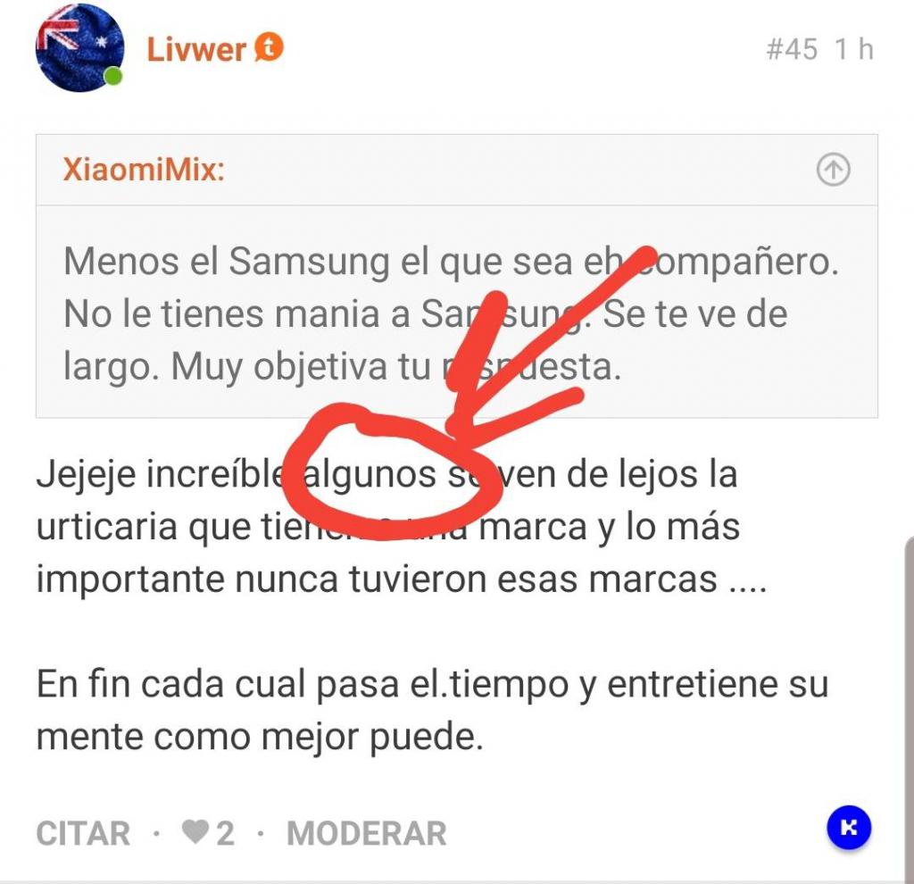 Simplemente me refería a que en este hilo veo gente sin el.terminal que solo hablan mal de esa marca generalizando y llamando bobos a muchos usuarios que si lo tienen. Repito la gente irrespetuosa las bloqueó. No tengo la necesidad de entrar en disputas absurdas, hablo y intercambio comentarios con gente que respeta ,me da igual guste o no guste Samsung o Xiaomi...etcetc Archivo Adjunto 1220234 Con respecto se puede debatir ,sin respeto o por odio personal a una marca no pierdo mi tiempo. ![]() Pero en ningún momento el xaval a nombrado a samsung para bien ni para mal, simplemente le a aconsejado el iphone 11 y el oneplus 7 pro. Cual es el problema? Si no nombran nuestro telefono nos ofendemos??? En fin... |