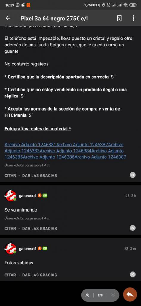 ![]() Sobre el post del foro * Título de la venta: Pixel 3a 64 negro * ¿Relacionado con smartphones o tablets?: Sí Sobre el producto * Marca: Google * Modelo: Pixel 3a * Precio: 265---255---245 € * Si vendes un teléfono, ¿es libre o de operadora?: Libre de fábrica * ¿Producto nuevo o de segunda mano?: Con uso * ¿Desperfectos?: Un pelo en la pantalla (Micro-arañazo no rotura) que con el protector (y sin el) no se ve, y algun micro arañazo en los laterales (nada grave, soy muy tiquismiquis)pero prefiero decir todo * Estado del producto (de 1 a 10): 8 * Tiempo de uso del producto: 29-Mayo-2019 * ¿Aceptas cambios?: NO Sobre el método de pago * Ubicación: León * Método de pago admitido por el vendedor: