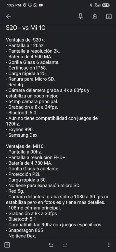 Bueno, pero la vez pasada uno por allí me replicó que la diferencia en batería no era casi nada. El procesador, la capacidad de la batería, la gestión de la carga rápida y la capa de personalización tienen mucho que ver en el sistema general de la autonomía. OJO, tomando en cuenta todos los apartados, es cierto que el S20+ gana, no por mucho, pero gana, pero en general, están muy parecidos. Todo depende de lo que el usuario necesite o le guste, pero por esa diferencia de precio, yo me voy sí o sí por el Xiaomi Mi 10. Es un teléfono que en productividad y apartados generales está muy a la par que el S20+, y además más barato.Name:  Screenshot_2020-08-12-13-02-54-659_com.google.android.keep.jpg