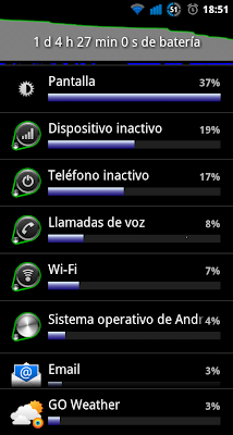 La desconecto del cargador a las 7:15. Utilizo Juice Defender para que me sincronice cada 15 minutos, la uso mucho para twitter y para Rss por las tardes, raticos con Angry Birds, Podcast al acostarme...y con este uso siempre puedo llegar a las 0:00 que es mas o menos cuando la conecto al cargador, ya os digo, con dias al 10% y dias con 50%, depende del uso.