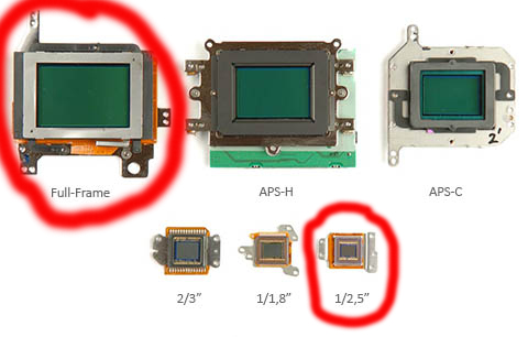 Arquitectura de 14 Bit Retroiluminado.. * 10 bit/12 bit/14 bit A/D converters Supporting type 1/2 5M effective pixels in 3 formats ![]() Comparar el Tamaño Fisico del Sensor Reflex Full Frame de 35mm con el tamaño de un Sensor de movil.. estan remarcados en rojo.. Un Saludo