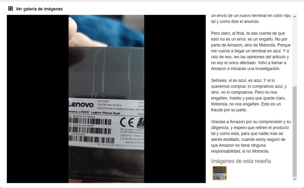 Editado, aclaro que la captura es para que se vea que te venden la version 16/512Gb en color azul, esta persona se siente "estafada" porque quiere la version 16/512gb en color rojo y le mandan la version 16/512Gb en color azul.....por 399€!!!!!!, de locos.