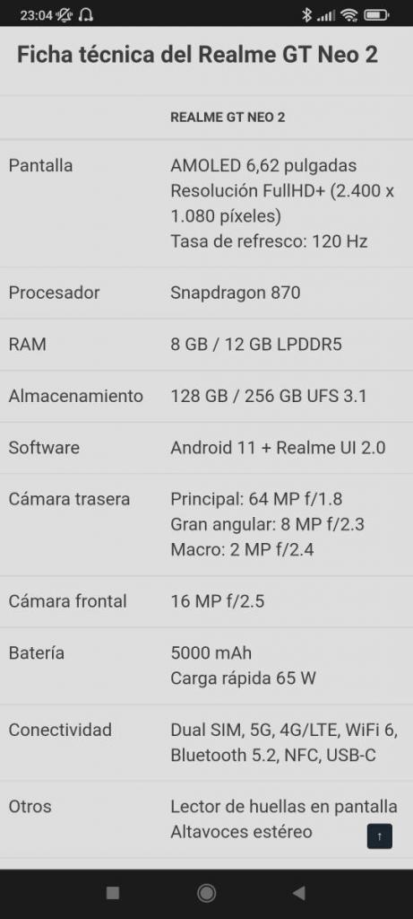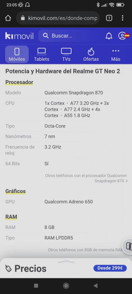 He buscado el tipo de RAM del Realme GT Neo 2 y en Xataka como en Kimovil indica que es LPDDR5, tal como se muestra en las imágenes.