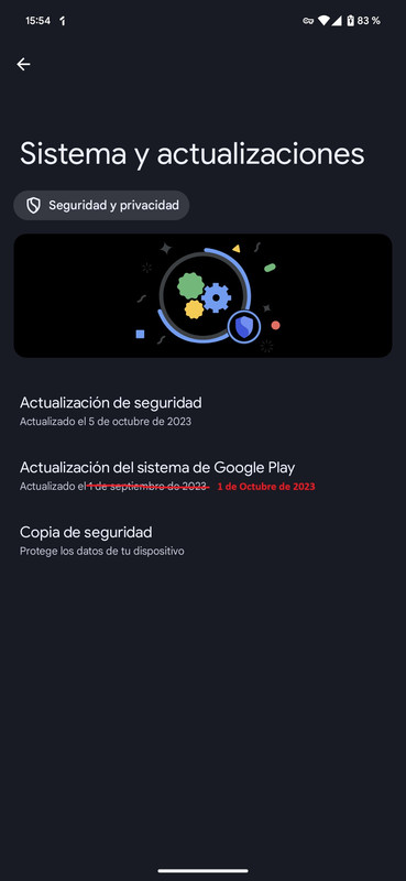 Con Pixel 7 Pro, si "me" aparece la fecha de 1 de octubre Con Pixel 8 Pro, no, la fecha es 1 de septiembre Si te vas a los parches, y lees, observas que es lo mismo Lo único variable, es "la dichosa fecha" que es algo anecdótico Pero, que en foros de consumo de gachet´s electronicos, de marcas, logos, y números, causa desconsuelo, como la etiqueta del 5G "+" ó de los Test Sinteticos de rendimiento, donde pasean foresenses foro a foro, para dejar claro que "el suyo" es el más rápido, es una cultura,. donde se entiende que "conducir a toda caña" te da estatus, y seña de ser mejor que... No le daría más importancia al "numeral" y lo que no dejaría es actualizar -el Sistema de Google Play- de vez en cuando, así como las App instaladas en el último OS Novedades de las actualizaciones del sistema de Google * support.google.com
