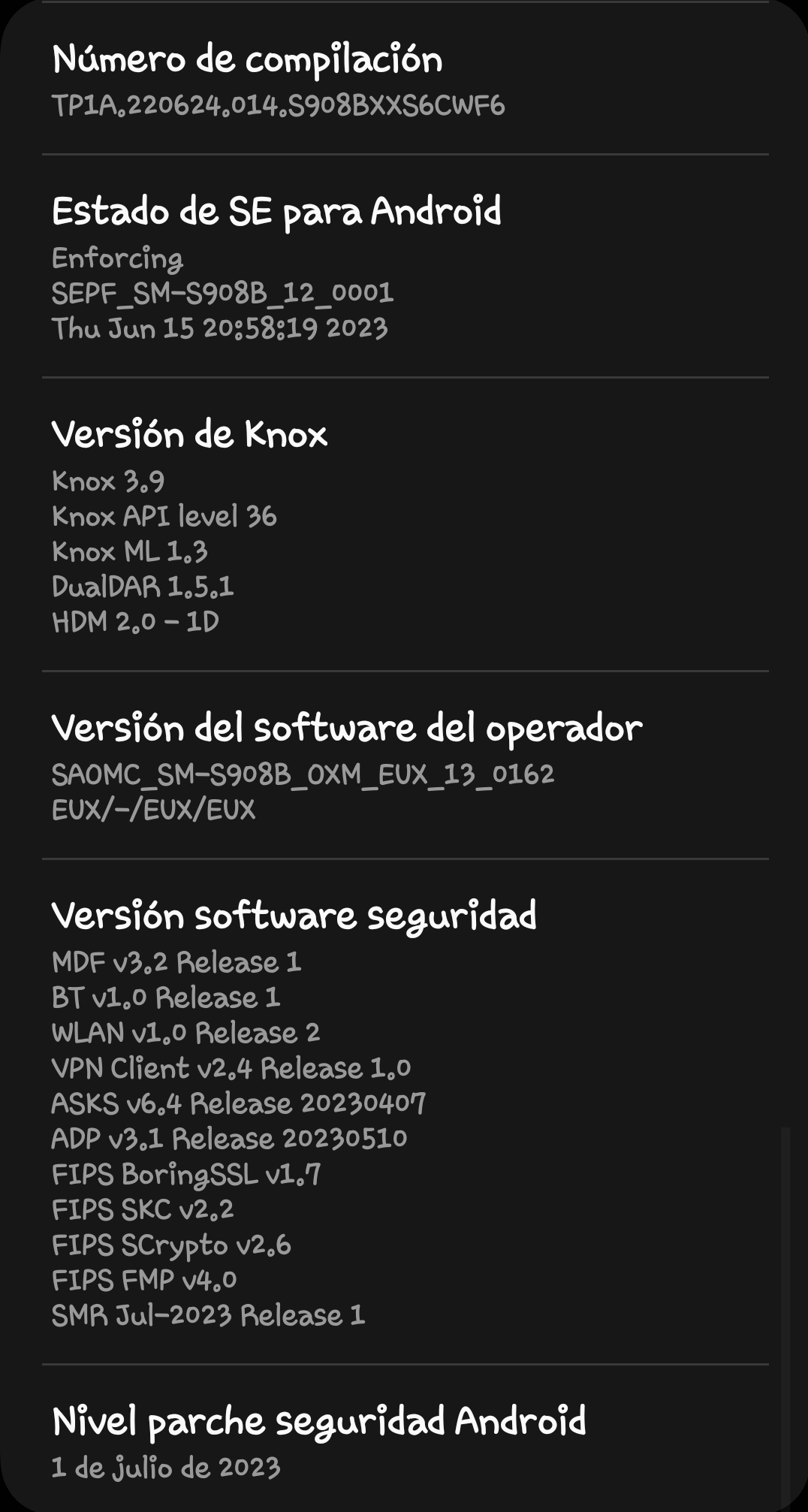 ![]() Me temo que Samsung Pay no se puede usar con tarjetas españolas a menos que tengas ROM y CSC español. Pero Google Pay funciona perfectamente bien para pagar con el móvil, así que es lo que yo uso. Que yo sepa, no existe un modelo sin letra o número después de "S908" y antes del "/DS" (aunque puedo estar equivocado). Por favor, dime cuál es el número de compilación del sistema operativo en tu teléfono, entrando en Ajustes > "Acerca del teléfono" (abajo del todo) > "Información de software", y tomando nota del código que viene en "Número de compilación". Me alegro de que también lo lograras. No sabía que en el S908E también se podía usar el CSC XSP, así que lo añado en lo que escribí arriba. ![]() IMG-20230508-WA0000.jpg