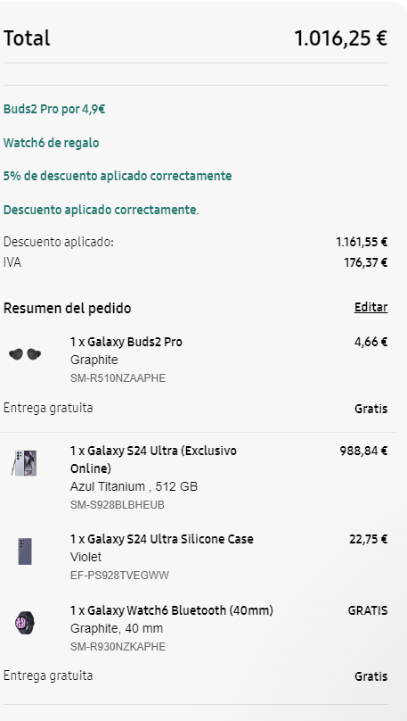 Y seguir este orden (en mi caso) Añadi S24 Violeta de 1Tb - Puse renove de mi S23U que no entregare (para el dto extra de 100€) - Cupon HOLA5 despues. CUPON HOLAS 24 y por ultimo CUPON dto de 120€ enviado por Samsung a mi mail