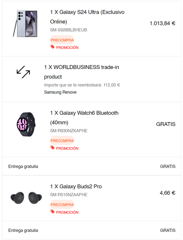 Bueno, al final colaron todos menos el de 120€ asi que un S24U Azul titanio de 512GB + Watch6 + Buds 2 Pro que se vienen para el norte por 1018,50€