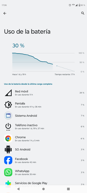 Llevo un par de semanas con el Edge 40 neo y estoy muy contento con el tlf, vengo de un HTC U11 con 5 años. Estoy haciendo pruebas de duración de batería, me sorprende que solo saco un poco más de 4h y media de pantalla y el 30% de consumo de la batería es de la red móvil. He probado seleccionando 4g y ha mejorado un poco pero sigo pensando que hay algo que me consume de más, aunque leí en reviews antes de comprarlo que la duración de la batería es menor que otras marcas con la misma capacidad de batería. Eso sí la batería me dura entre dia y medio y dos días. Cuánto os dura a vosotr@s la batería??? Saludos |