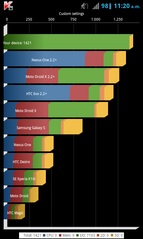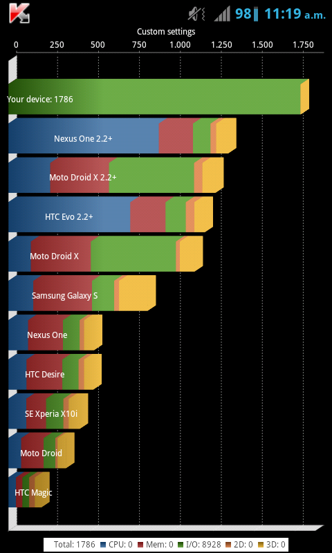 para comparar, que eso nos encanta aunque no lo reconozcamos, os dejo un quadrant del NExus S overclock a 1200mhz, vemos que las pruebas con mi galaxy s dan mas resultados: