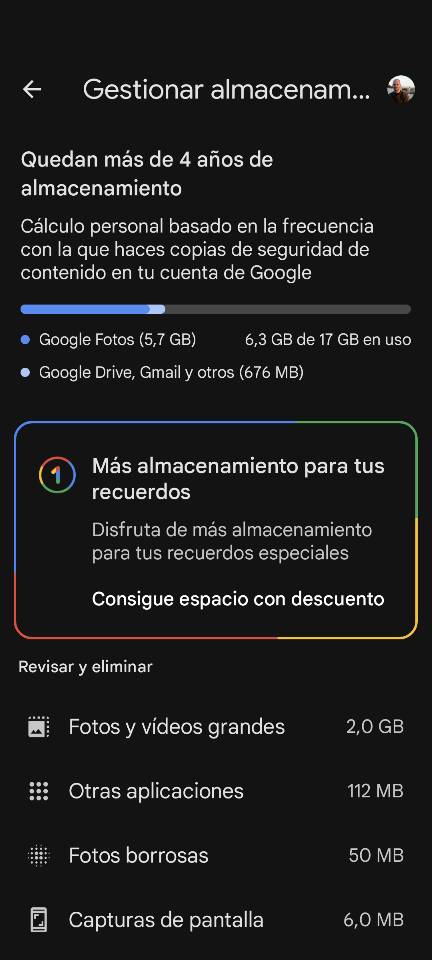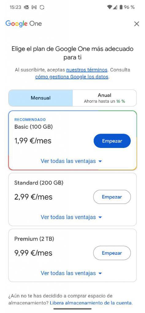 Tú lo estás mirando desde Google one, yo también acabo de acceder ahora y veo que me salen unas opciones diferentes a cuando entro desde Google fotos. En Google fotos, pinchando en el círculo de usuario, arriba a la derecha , entras por almacenamiento de la cuenta, te aparece un recuadro en el que te pone más almacenamiento para tus recuerdos y ahí también está el acceso a planes desde 1,99. Pinchando ahí, te lleva a opciones diferentes. Te pongo las dos capturas ,primero la de Google one y después lo que me sale yendo desde Google fotos. Claro, yo como donde controlo el almacenamiento o capacidad que me queda todavía de almacenamiento , en Google fotos, pues las opciones que me salen son las que ves ahí.Archivo Adjunto 1539909Archivo Adjunto 1539910 ![]() |