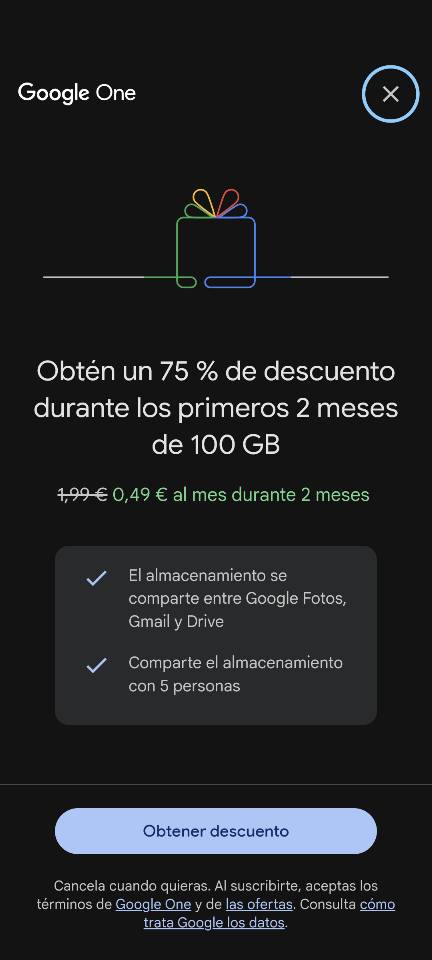 Hola, compañeros. Pues la curiosidad me ha podido y he pillado la oferta de Google One de 0,49 €/mes durante dos meses, para el plan de 100 GB (Basic). Luego sería 1,99 €/mes. Nunca había pagado por esto, pero bueno. Si se paga el año completo, lo rebajan a 19,99.