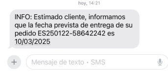 INFO: Estimado cliente, informamos que la fecha prevista de entrega de su pedido ESXXXXXXXXXXX es 10/03/2025 Me he quedado con los cojones al rojo vivo jajajaja Me rio ppr no llorar. |