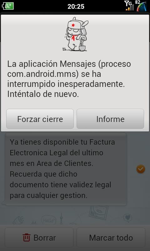 Pero estos reyes le he regalado a mi pareja otr Galaxy SII, y he procedido a meterle esta rom como el catecismo de la misma manda: KH3 -> los 3 wipes -> desde recovery la v.5 y le sucede exactamente como a mi. Te lo ilustro en imágenes para que entiendas mejor lo que trato de explicarte: Tengo este sms con dos mensajes a su vez en el interior: ![]() Quiero eliminar el segundo mensaje pues no me interesa....procedo a marcarlo y pulso en la opción de borrar: ![]() Y como te comentaba...FC al canto.... ![]() Que conste, e insisto, que en otro Galaxy con una instalación limpia, de hecho esta es la primera rom que tiene diferente a la original, más de lo mismo... Espero que esto sirva para aclarar un poco el asunto...;) ![]() Enviado desde mi GT-I9100 usando Tapatalk