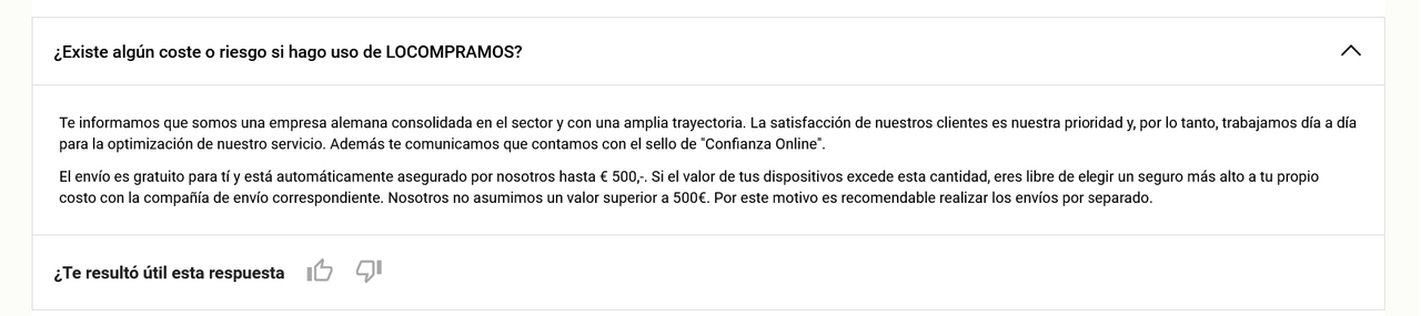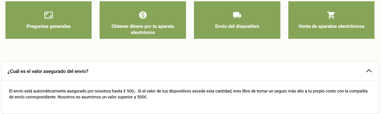 "El envío está automáticamente asegurado por nosotros hasta € 500,-. Si el valor de tus dispositivos excede esta cantidad, eres libre de tomar un seguro más alto a tu propio costo con la compañía de envío correspondiente. Nosotros no asumimos un valor superior a 500€."