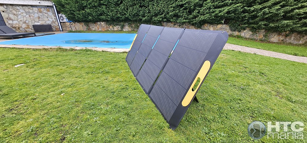 El despliegue del panel solar en exteriores es un proceso realmente sencillo. Para esta prueba lo hemos colocado en una zona de jardín despejada aprovechando que el sistema se mantiene firme por sí solo.