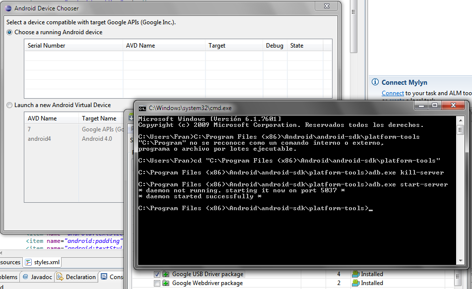 Si eclipse no te detecta el móvil instala el Google USB driver package del sdk y reinicia adb.